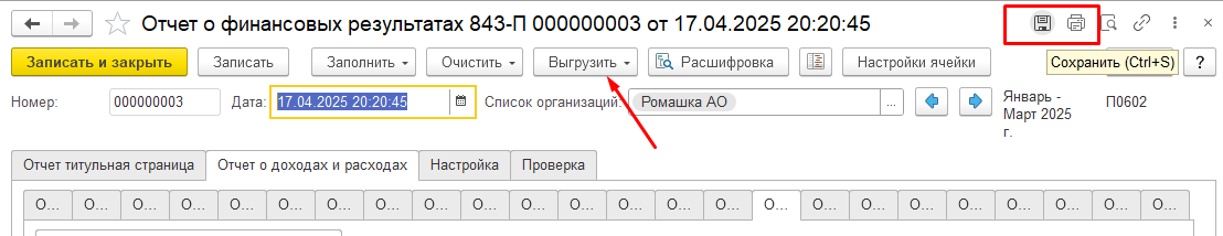 Заполненные формы бухгалтерской отчётности доступны для экспорта в форматы электронных таблиц (xls/xlsx), текстовых документов (docx) или PDF, а также для печати.