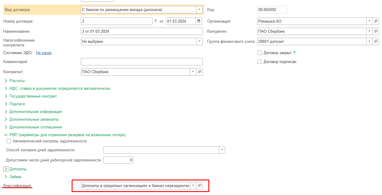 Для автоматического заполнения этой ячейки необходимо предварительно присвоить классификацию всем депозитным договорам.
