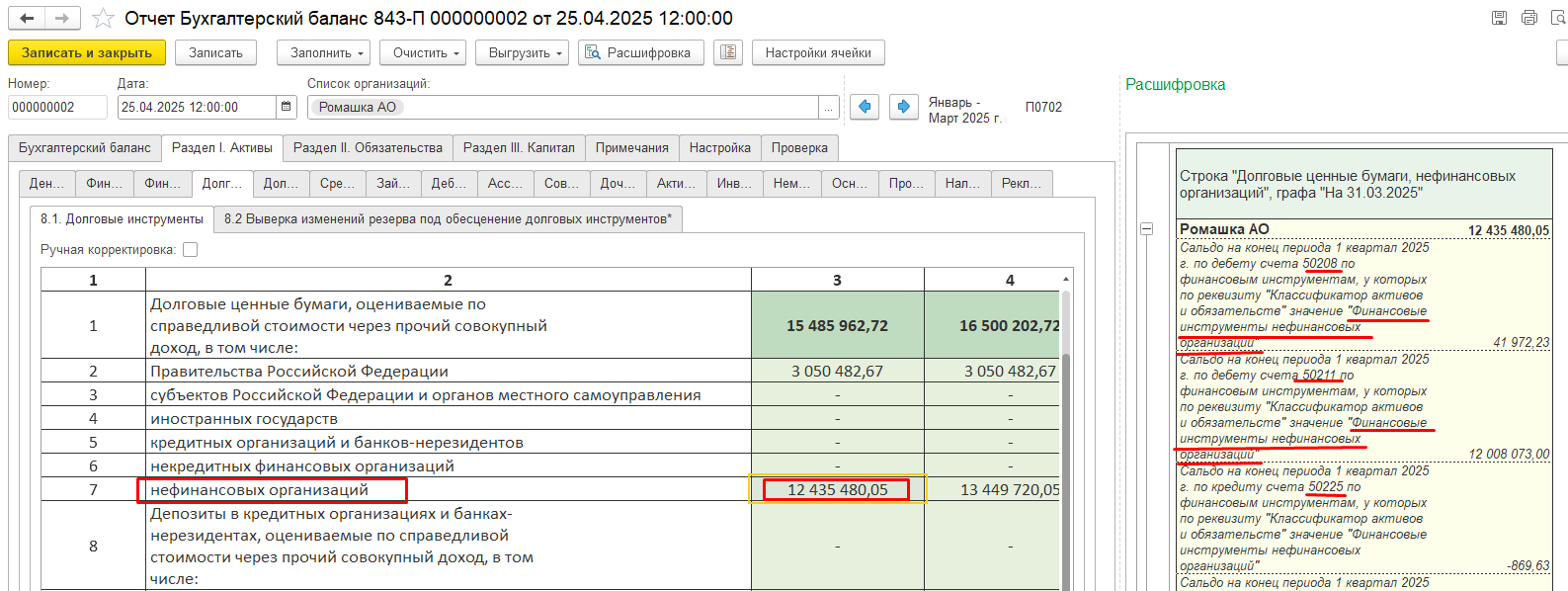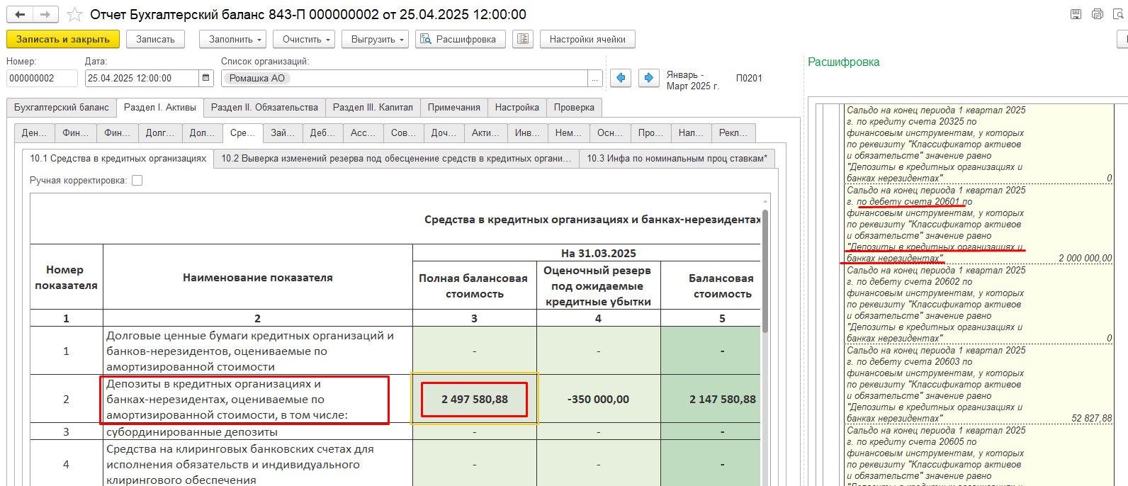 Сведения о правилах классификации, применяемых для формирования значений показателей БФО, доступны через команду «Расшифровка» в выбранной ячейке с заполненными данными. Расшифровка отображает критерии формирования значения: классификацию активов и обязательств, а также соответствующие счета плана счетов.