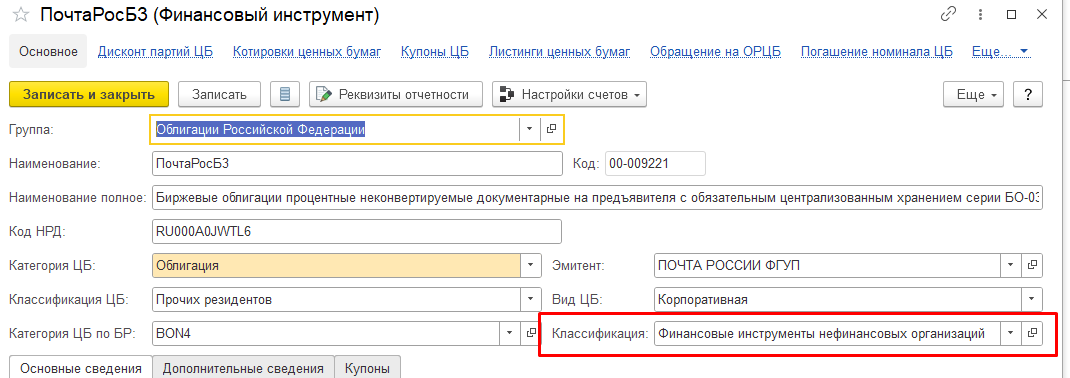 При автоматическом заполнении отчётности БФО для корректного формирования данных по ценным бумагам необходимо заранее присвоить им соответствующую классификацию в справочнике Ценные бумаги. В противном случае в отчётности эти данные будут отражены обобщённо — единым показателем без классификации: