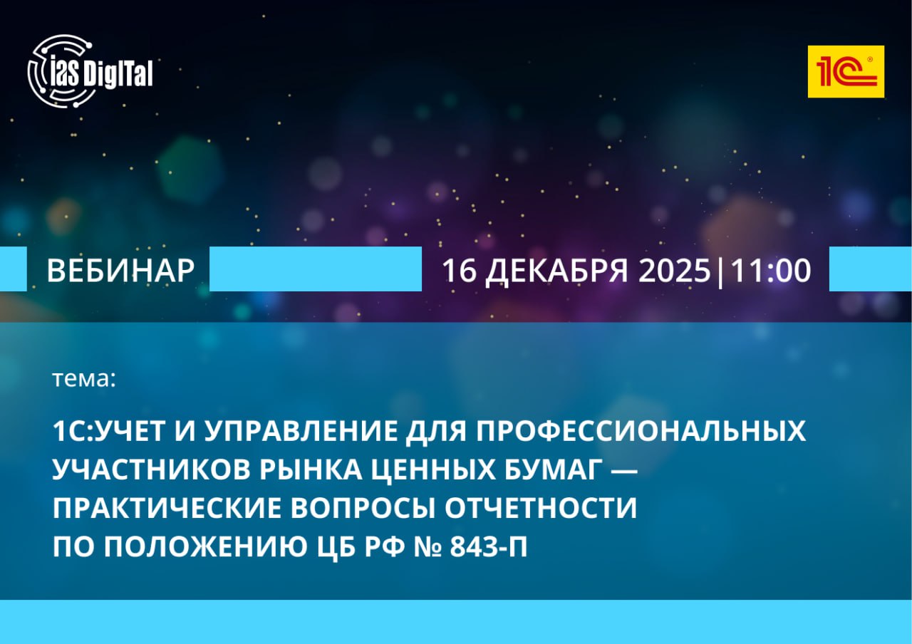 Фирма «1С», совместно с «ИАС ДИДЖИТАЛ», проводит вебинар на тему «1С:Учет и управление для профессиональных участников рынка ценных бумаг – практические вопросы отчетности по положению ЦБ РФ № 843-П».